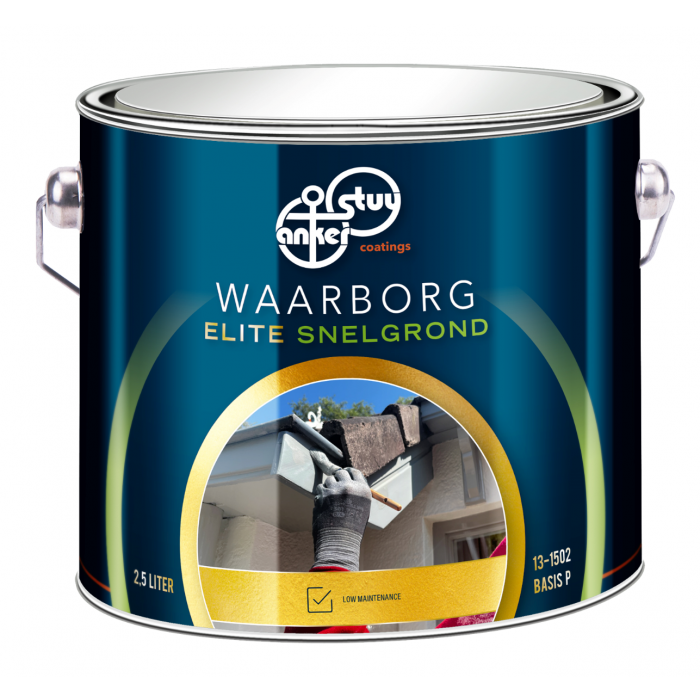 Een sneldrogende grondprimer voor buiten op basis van gemodificeerde alkydhars. Deze primer kenmerkt zich door goede verwerking en vloeiing, een snelle droging/doordroging, zeer goede isolatie bloedende houtsoorten en een uitstekende hechting op diverse voornoemde ondergronden. Ook is er geen drogingsvertraging op kritische ondergronden, zoals vulmiddelen op basis van kunststoffen, zoals 2K epoxy resp. urethaan. De primer is snel overschilderbaar met alkydharsverf producten, een goede intercoat hechting en heeft een snelle schuurbaarheid. De Waarborg Elite Snelgrond is geschikt voor buiten en verkrijgbaar in 1 liter en 2,5 liter in verschillende kleuren.